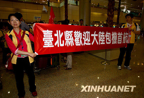 7月4日,台北县的市民在台北桃园机场欢迎大陆包机到达。 新华社记者陈建力摄