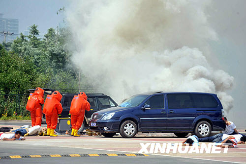 6月11日,身穿防化服的侦检人员在发生化学“爆炸”的北京朝阳公园沙滩排球场外进行“侦检”。(新华社记者罗晓光摄)