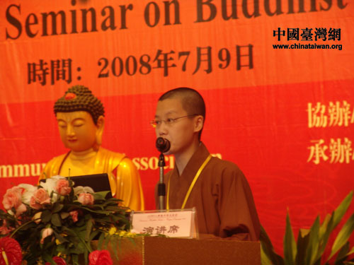 台湾生命电视台的仁朗法师在用英文做演讲(贺晨曦 摄)