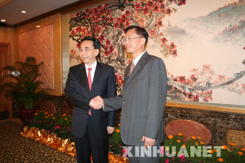 7月12日,应中共广州市委书记朱小丹邀请,中国国民党高雄市委员会广州访问团搭乘高雄至广州周末包机抵达广州访问。这是中共广州市委书记朱小丹(左)与中国国民党高雄市委员会主委许福明亲切握手。 新华社发(闫洁 摄)