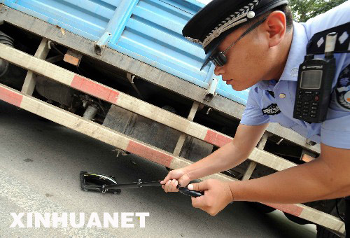 7月15日,北京警方在通州觅子店检查站对车辆进行安全检查,觅子店是天津、河北车辆进京的一个通道。当日上午9时,北京警方正式启动巡逻防控“三道治安防线”,在与河北、天津等外省市接壤的第一道防线卡点将对进京车辆和人员实施安全检查。 新华社记者 李文 摄
