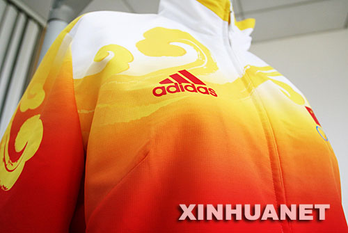 当日,以红黄色为主色调、印有祥云图案的北京奥运会中国代表团领奖服装在北京正式面世。 新华社发