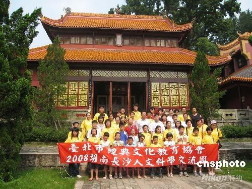 7月17日,来自台湾“亲子读经班”的人文科学交流团与大陆家庭一同在岳麓书院文庙前合影。据悉,家长和孩子一起诵读古文经典在台湾已经蔚然成风,推广该教育模式的台北市经典文化教育协会决定在大陆复制,并选择长沙作为首个示范地推广。 中新社发 刘双双 摄