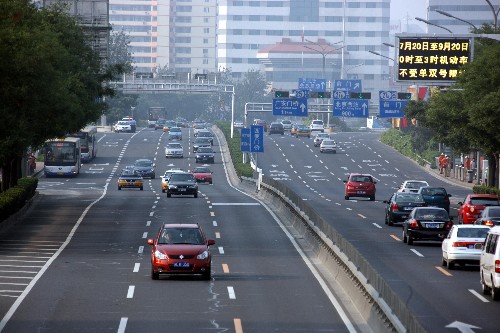 7月20日,汽车在北京西二环行驶。当日,北京开始实施“机动车单双号限行”措施,以保证北京奥运会、残奥会期间交通正常运行和空气质量。根据北京市发布的通告,从7月20日0时至9月20日24时,北京市机动车及外省区市进京机动车需按号牌尾号分单双号上路行驶,期间每日设置3个小时缓冲时间,0时至3时机动车上路不受单双号限制。 新华社记者 高学余 摄