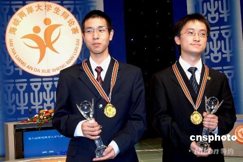 7月23日,来自台湾的东吴大学代表队选手张哲耀(左)、复旦大学代表队选手方俊共同荣获第七届海峡两岸大学生辩论赛最佳辩手奖。当日,历时3天的第七届海峡两岸大学生辩论赛在福州圆满落幕。 中新社发 刘可耕 摄