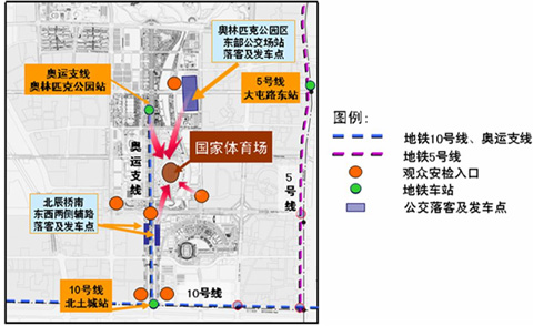 此外,观众也可以乘坐地铁线抵达。一是乘坐地铁10号线在北土城站出站,经安检后换乘8号线(奥运支线),直达奥林匹克公园站;二是乘坐地铁5号线至大屯路东站,换乘开幕式公交专线到达奥林匹克公园区东公交场站。