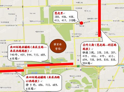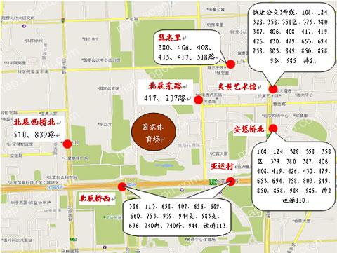 观众抵达奥林匹克公园区常规公交线路及车站分布图