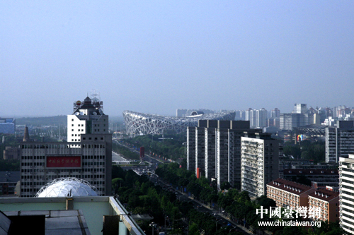 毗邻邻北三环的北京国际新闻中心顶楼成为记者取景的好地方,从高处望去,鸟巢好像近在咫尺。(摄影:李徽)