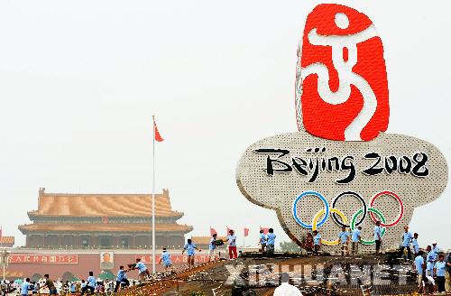 7月28日,工人们在天安门广场用鲜花装点“中国印”。当日,天安门广场迎接奥运会花卉景观制作工作继续紧张进行,将有100万盆精心培育的花卉在此进行摆放。新华社记者 徐家军 摄