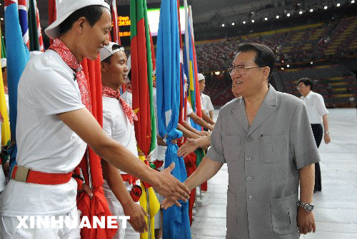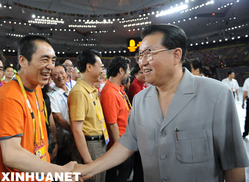 8月2日,中共中央政治局常委李长春观看了奥运会开幕式预演,并在演出结束后亲切看望慰问主创人员和演职人员代表,对预演成功表示祝贺,受胡锦涛总书记委托,向参加演出的全体人员表示亲切慰问。 新华社记者 马占成 摄