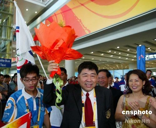 8月3日下午,中华台北代表队一行50人,经香港转机抵达北京,征战2008年北京奥运会。图为代表队抵达北京后,中华台北奥运代表团主席蔡赐爵受到热烈欢迎。 中新社发 富田 摄