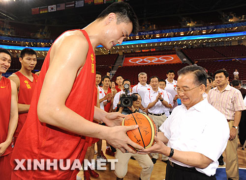 这是温家宝来到位于五棵松的奥林匹克篮球馆,看望志愿者和运动员。姚明代表中国男篮向总理赠送签有队员名字的篮球。新华社记者黄敬文摄