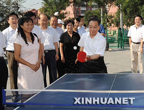 这是温家宝在丰台区大井社区和群众打乒乓球。新华社记者黄敬文摄