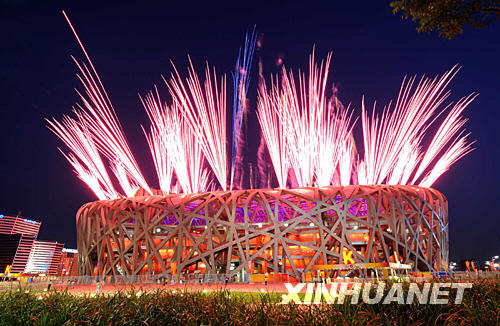 8月2日,2008北京奥运会开幕式第二次彩排在国家体育场——“鸟巢”举行,并进行焰火调试。 新华社记者 李钢 摄