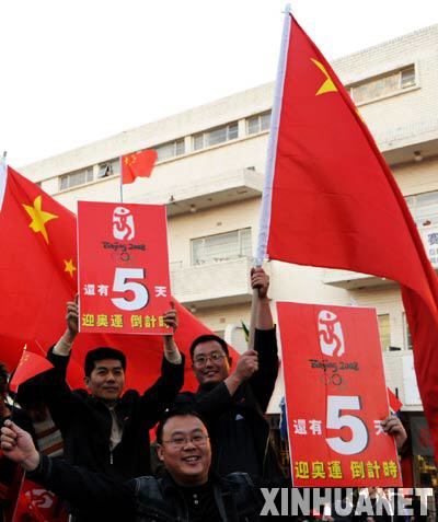 8月2日,南非华侨华人手举国旗和奥运会倒计时牌,庆祝北京奥运会即将开幕。当日,南非华侨华人在约翰内斯堡唐人街举行“迎奥运、倒计时”活动,庆祝北京奥运会即将召开。包括中国驻南非使领馆官员、华侨华人和南非当地友人在内的近两千人参加了活动。 新华社记者梁尚刚摄