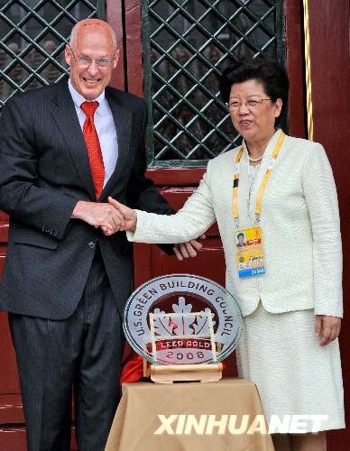 新华网北京8月13日奥运专电(记者汪涌)美国财政部长保尔森13日专程来到北京奥运村,代表美国绿色建筑协会为北京奥运村颁发绿色环保金奖“能源与环境设计先锋金奖”。