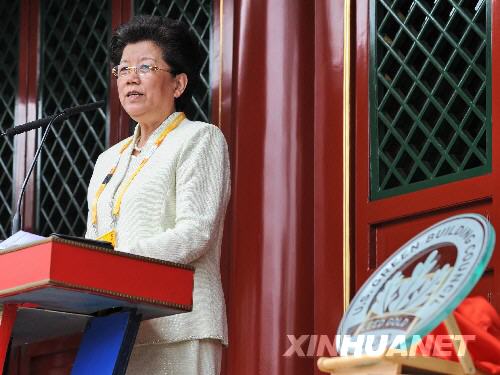 8月13日,全国人大常委会副委员长、北京奥组委副主席、北京奥运村村长陈至立在颁奖仪式上致辞。新华社记者张国俊摄