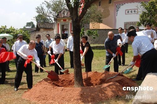 八月十四日下午,中国国民党主席吴伯雄一行在福建永定县高北土楼群的“土楼王”承启楼前种下一棵香樟树,纪念此次祖地之行。 中新社发 郑祚声 摄