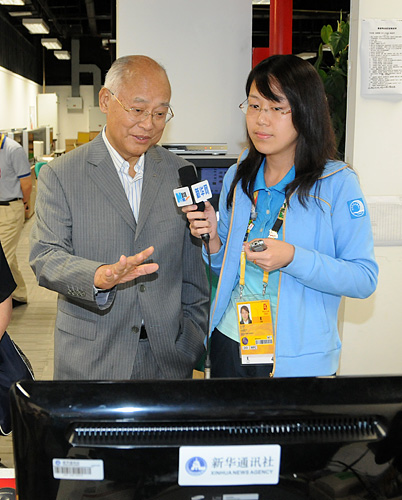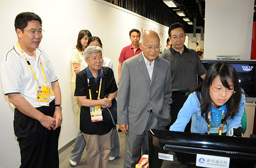 8月16日中午,北京奥组委执委、国际奥委会文化与奥林匹克教育委员会主席何振梁参观设在北京奥运主新闻中心的新华社奥运报道前方发稿中心。新华网 陈竞超 摄