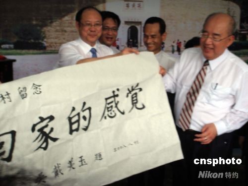 8月15日18时50分左右,中国国民党主席吴伯雄结束赴闽谒祖之旅,乘周末包机从厦门直航返台。图为吴伯雄在他的家乡福建永定县下洋镇思贤村展示其夫人的题词,这正是他此行返乡谒祖内心感受的真实写照。 中新社发 陈悦 摄
