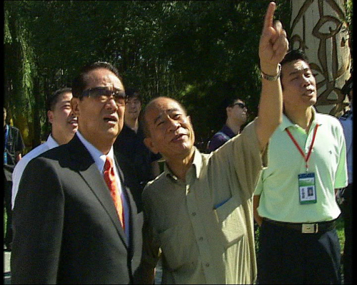 8月16日上午,宋楚瑜在北京朝阳公园参观由台湾著名艺术家吴炫三创作的“我们都是一家人--都会丛林 绿色奥运”雕塑艺术展。图为吴炫三在为宋楚瑜讲解自己的作品。