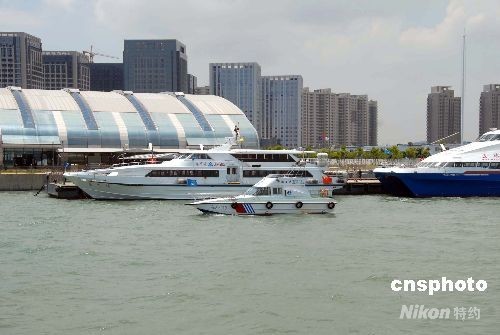 八月十八日上午,厦门五通码头到金门水头码头的厦金“第二航线”试航试靠成功,预计将于月底开通。图为参加试航的“泉州轮”与“五缘轮”两艘厦金航线客轮正试靠厦门五通码头。 中新社发 陈新飚 摄