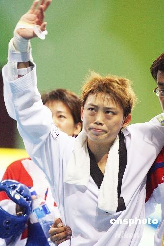 8月21日,在北京奥运跆拳道女子57公斤级比赛中,中华台北选手苏丽文数次因膝盖剧痛而倒地,但都忍下痛楚爬起继续拼战,虽然最后落败,但赢得全场的掌声。 中新社发 chinatimes 摄