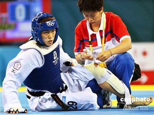 8月21日,在北京奥运跆拳道女子57公斤级预赛中,中华台北选手苏丽文(左)对阵韩国林秀贞,苏丽文在比赛中膝盖受伤数次跌倒,防护员上场防护时,苏丽文神情相当痛苦,但仍撑到比赛结束。 中新社发 chinatimes 摄