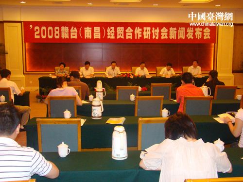 中国台湾网9月2日消息 由国务院台湾事务办公室和江西省人民政府共同主办的2008年赣台经贸合作研讨会新闻发布会今日在南昌举行。“研讨会”组委会有关负责人就会议的筹备情况、主要特点及赣台经贸合作情况作了介绍。此次“研讨会”将于9月21日至26日在南昌举办,届时将有1000余位台湾客商和知名人士出席会议。