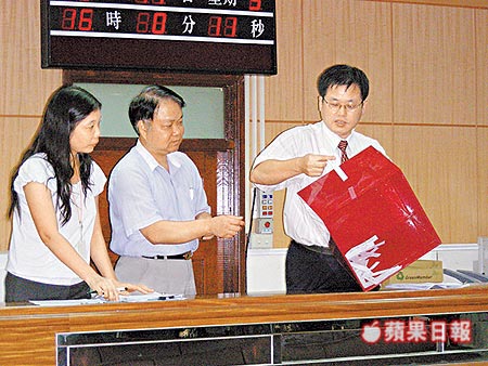吴淑珍明天可能出庭,台北地方法院庭长黄俊明(右)昨抽签决定20名旁听民众。来源:台湾《苹果日报》
