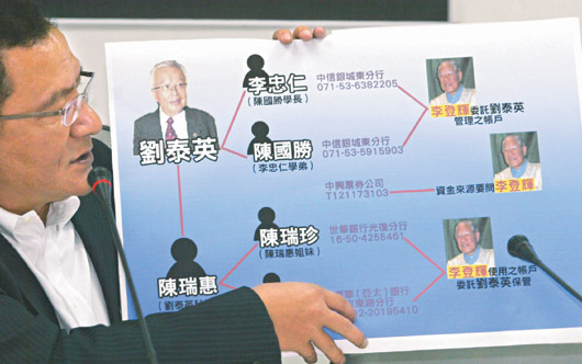 据报道,高志鹏昨天举行记者会,称前“中华开发”董事长刘泰英于2003年新瑞都案调查期间就在“调查局”供述,当时留下资料,“为何查不下去?应该去问检调!”他暗指李登辉早在1995年就汇款到海外。