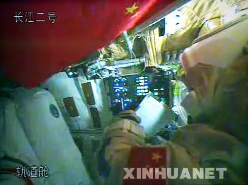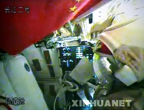 新华网北京9月27日电(记者张汨汨、田兆运)在长达十几小时的准备工作之后,神舟七号航天员翟志刚穿着“飞天”舱外航天服,于26日23时36分第1次在茫茫太空中的神七轨道舱内亮相。