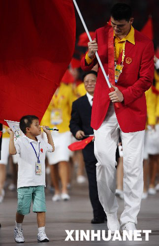 这是8月8日,中国代表团旗手姚明和九岁半的抗震救灾小英雄林浩一起入场。当晚8时,第29届夏季奥林匹克运动会在国家体育场——“鸟巢”隆重开幕。 新华社发(资料照片)