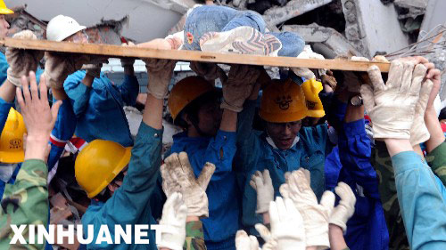 这是5月13日,在四川绵竹市汉旺镇一所中学内,救援人员经过十几小时的艰苦努力,终于从废墟中救出一位女学生。新华社发(资料照片)