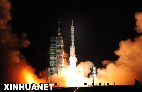 这是9月25日21时10分,长征二号F型运载火箭点火,神舟七号飞船在酒泉卫星发射中心升空。 新华社发(资料照片)
