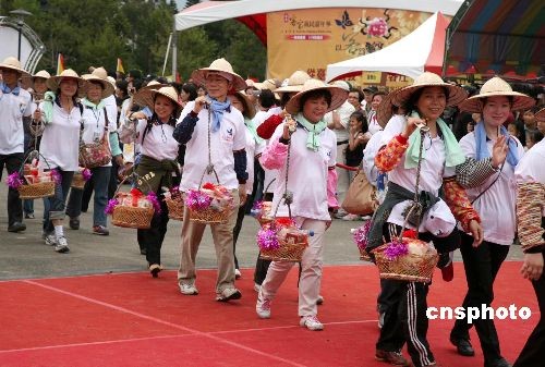 台北客家人的狂欢节——二00八台北客家义民嘉年华活动,于十月十一、十二日在台北举行。该活动以“义民爷”祭典为主轴,附设优质客庄博览会、客家文化展、客家十八般才艺决赛等项目,就像一场客家文化的盛宴,引得民众把足球场大小的场地围得里外几层。图为富有特色的“挑担奉饭”场面。 中新社发 杨旭 摄