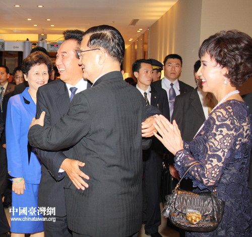 4日晚间,国民党荣誉主席连战在台北国宾饭店宴请海协会会长陈云林一行。这是连战与夫人在宴会厅入口迎接陈云林与夫人,两位老朋友在台湾热情相拥。(田云鹏 摄)