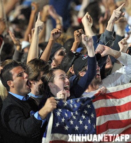 11月4日,在美国芝加哥格兰特公园,美国民主党总统候选人奥巴马的支持者在得知奥巴马在宾夕法尼亚州可能获胜的消息后欢呼庆祝。美国媒体根据美国总统选举初步结果预测,奥巴马将在大选关键州之一宾夕法尼亚州获胜,获得该州21张选举人票。 新华社/法新