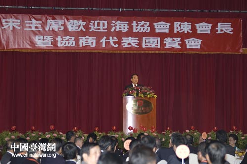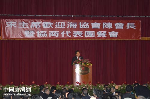 亲民党主席宋楚瑜5日设午宴欢迎海协会会长陈云林及海协会协商代表团一行。这是宋楚瑜在宴会开始前上台致辞。中国台湾网 田云鹏摄