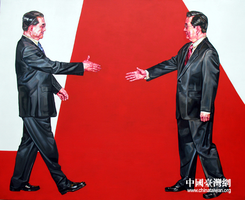 中国台湾网11月10日北京消息 在海协会会长陈云林结束历史性访台之际,艺术界也开始将目光集中在两岸缔造的历史成就上。日前,素以刻画政治人物而闻名的画家马堡中在北京展出了其2008年的一批最新作品。其中,一幅以中国共产党中央委员会总书记胡锦涛与中国国民党荣誉主席连战在2005年“历史性握手”为主题的油画,成为各界关注焦点。