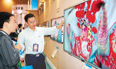 在2008中国苏州电子信息博览会上,一名工作人员向参观者介绍超薄新款电视机。朱桂根摄(新华社发)