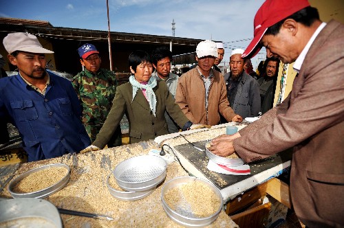 农民在宁夏石嘴山市平罗县通伏乡米业协会销售稻谷(10月15日摄)。近日,宁夏水稻喜获丰收,一些地区成立的米业合作社,让农民卖粮难、兑付难的问题基本得到解决。宁夏石嘴山市平罗县各米业协会旗下的大米加工企业与米业合作社互通信息,采取现金收粮的方式,提高农民卖粮的积极性。新华社记者 马俊 摄