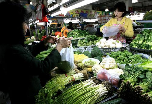 11月10日,顾客在上海市的一家菜场选购蔬菜。来自上海最大的蔬菜集散地上海江桥蔬菜批发市场的信息显示,自今年8月以来,上海蔬菜价格一直处于下跌趋势,10月底,上海市场蔬菜混合平均价格为1.48元/公斤,较去年同期1.77元/公斤已下降两成。新华社记者 陈飞 摄