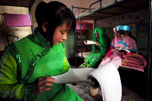 10月14日,在甘肃省积石山保安族东乡族撒拉族自治县保安族中学,几名保安族女学生在宿舍里学习。新华社记者张锰摄