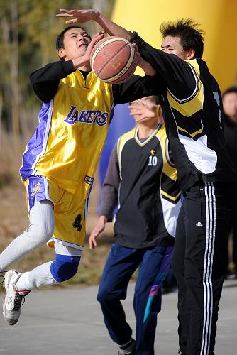 12月5日,南京市高淳一队球员(左)在比赛中带球突破。当日,南京市“建设新农村”农民男子篮球赛分别在南京市高淳县古柏镇武家嘴村和淳溪镇戴村新建的“新农村体育健身工程”篮球场举行,共有来自南京市7个区县的8支农民篮球队参加了本次比赛。新华社记者韩瑜庆摄