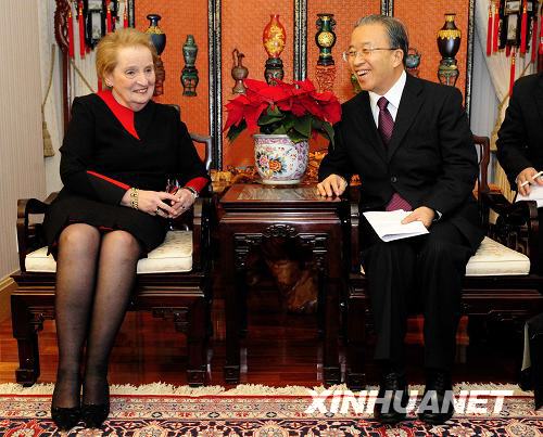 12月13日,在美国首都华盛顿,正在美国进行工作访问并举行中美战略对话的国务委员戴秉国(右)会见美国前国务卿奥尔布赖特。新华社记者张岩摄
