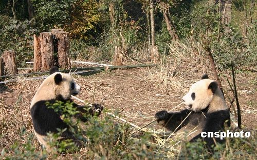 12月11日午后,阳光明媚,即将赴台的大熊猫“团团”和“圆圆”小两口正在四川雅安碧峰峡基地亲密地享受着“阳光浴”, “团团”(右)倚着树枝与“圆圆”相对而坐,津津有味地吃着鲜竹。 中新社发 霍潺 摄