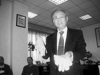 上海翔茂公司董事长李茂盛展示公司生产的手套。