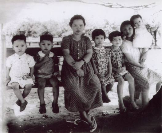 左起:作者谢雨辰、三哥、母亲、二姐、大姐、保姆、大妹(摄于1945年台湾台中公园)