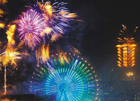高雄市跨年晚会“大港OPEN 高雄飞”昨晚在统一梦时代广场时代大道举行,吸引逾20万人观赏。轮状烟火点燃,进入倒数计时,历时3分钟烟火,或橘、或绿、或紫,色彩变幻万千,点亮了南高雄的夜空。